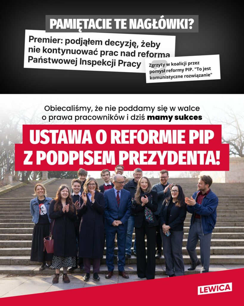 – Państwo staje po stronie ludzi pracy i w końcu mówi jasno: dość śmieciówek! Ustawa o PIP przygotowana przez ministerstwo pracy, przyjęta przez rząd i większość parlamentarną, ustawa oczekiwana i popierana przez większość Polek i Polaków zyskała właśnie podpis Prezydenta. To dobra wiadomość dla milionów polskich pracowników. Dla młodych wkrajaczących na rynek pracy, dla pracujących rodziców potrzebujących stabilności, dla wszystkich ciężko pracujących Polaków, zbyt często pozbawianych należnych im praw. Państwowa Inspekcja Pracy – silniejsza, skuteczniejsza i sprawniej działająca – w końcu pomoże im te prawa odzyskać. A wraz z nimi odzyskać to, co najcenniejsze – godność i bezpieczeństwo – komentowała wejście w życie reformy Państwowej Inspekcji Pracy ministra Agnieszka Dziemianowicz-Bąk.